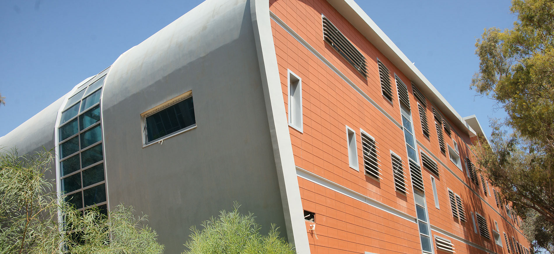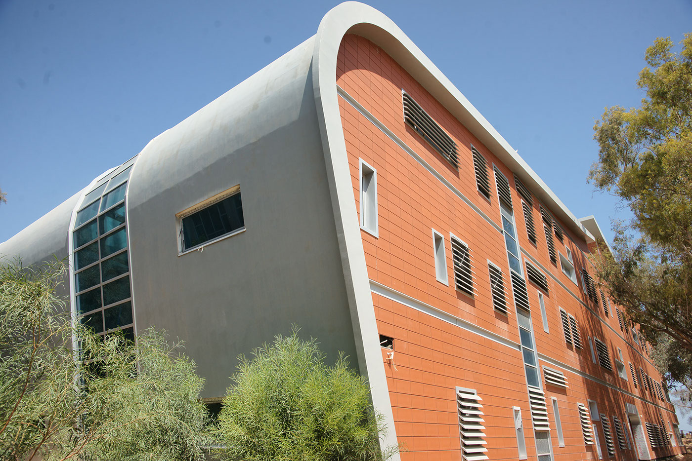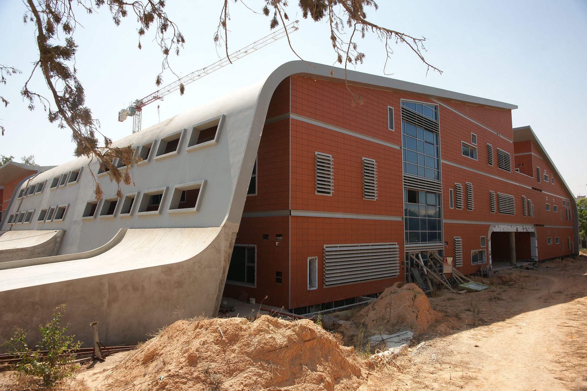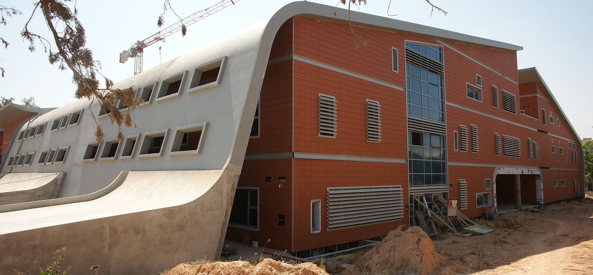 The Faculty of Physical Education sits at the western end of the main axis road on axis with the central pedestrian linear piazza and characterised by a large wrap around mashrabia screen that acts as sun shading to both the outside walls of the teaching wings and the roof.