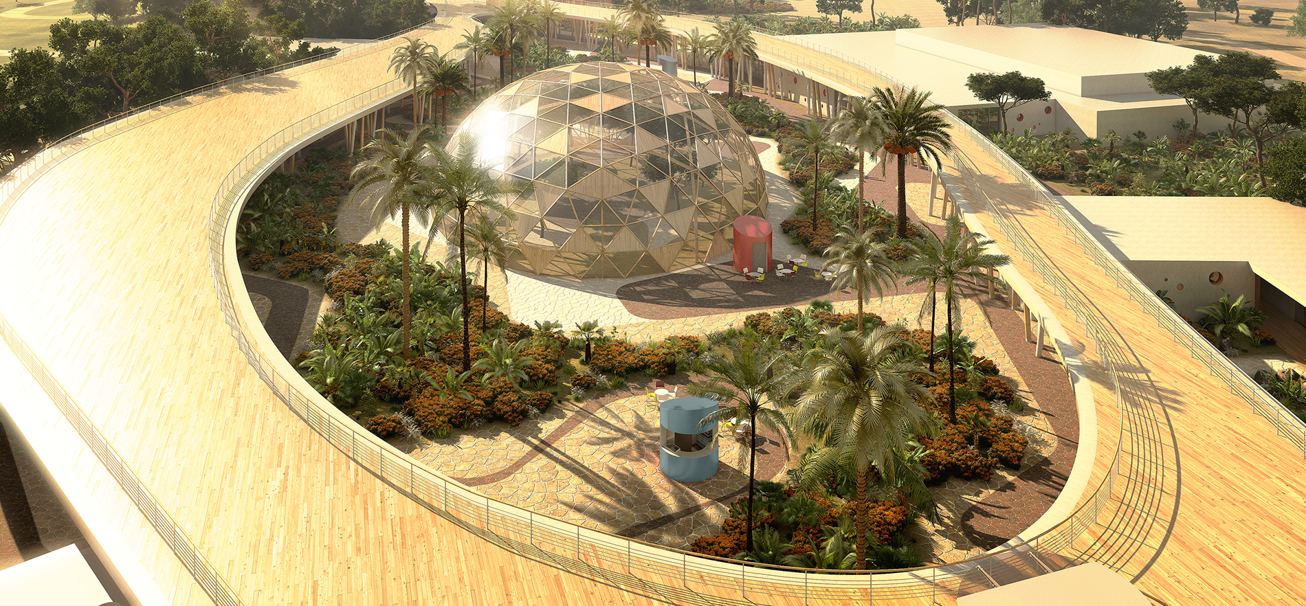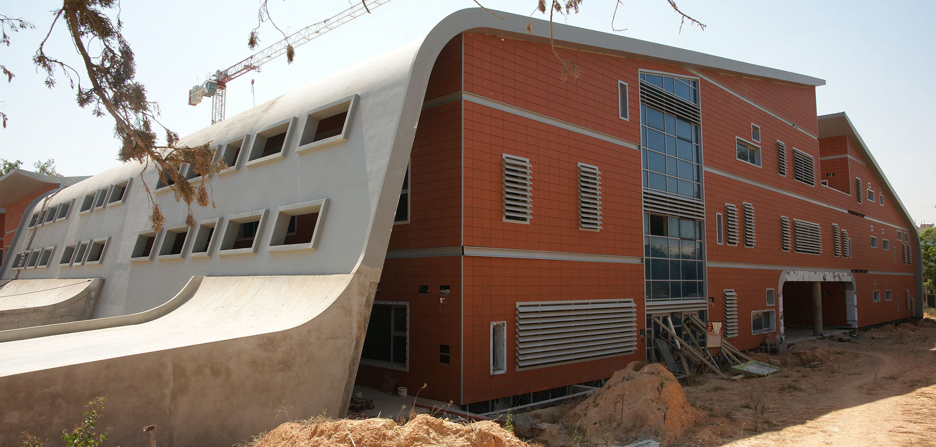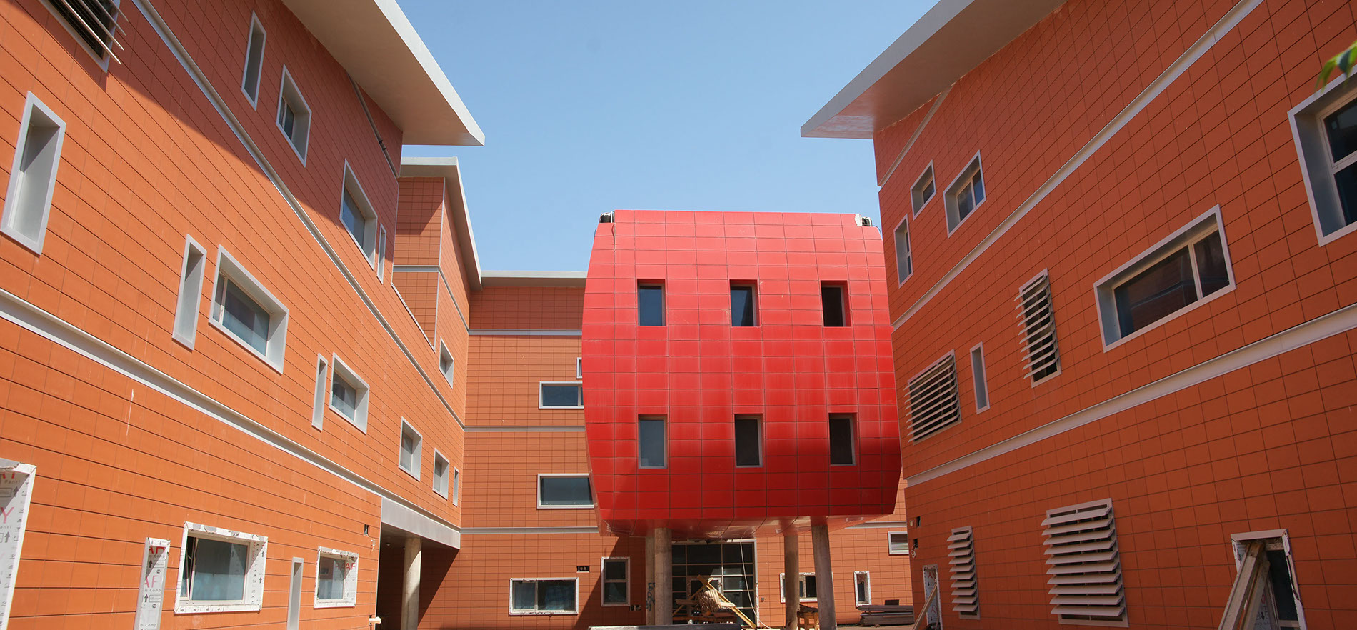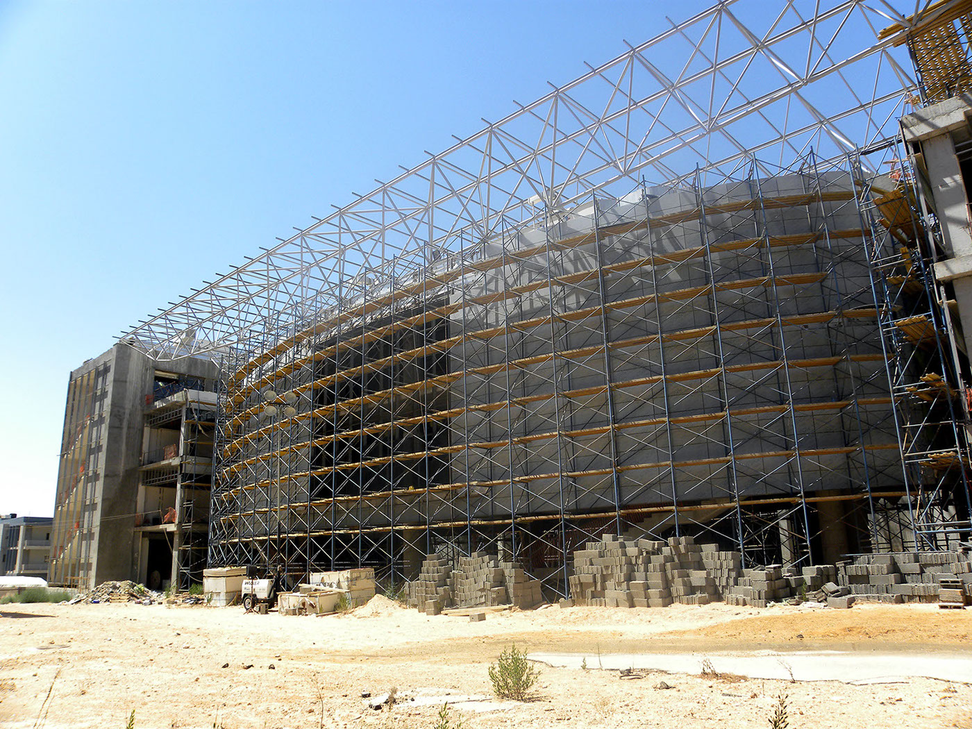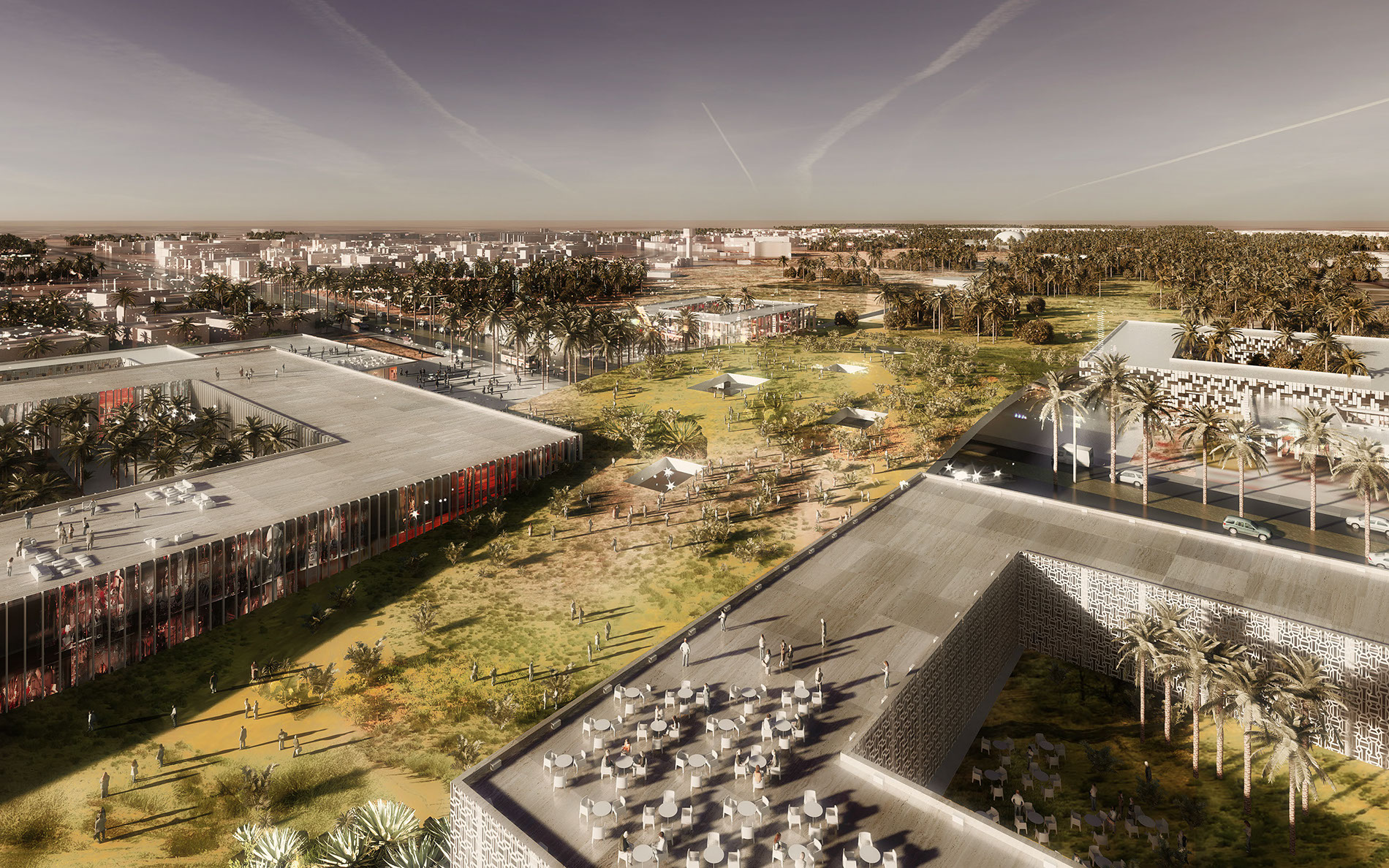The Faculty of Physical Education sits at the western end of the main axis road on axis with the central pedestrian linear piazza and characterised by a large wrap around mashrabia screen that acts as sun shading to both the outside walls of the teaching wings and the roof.
