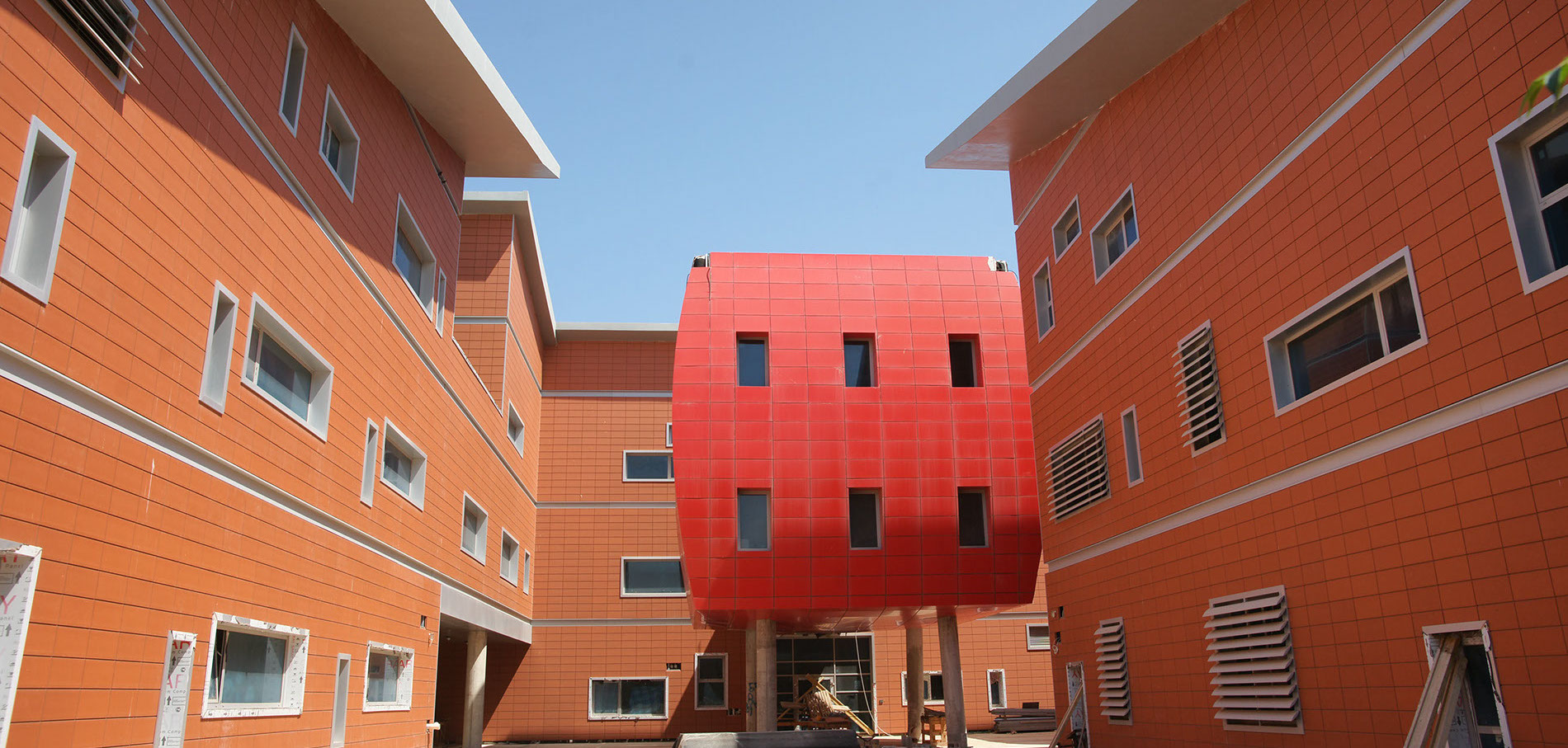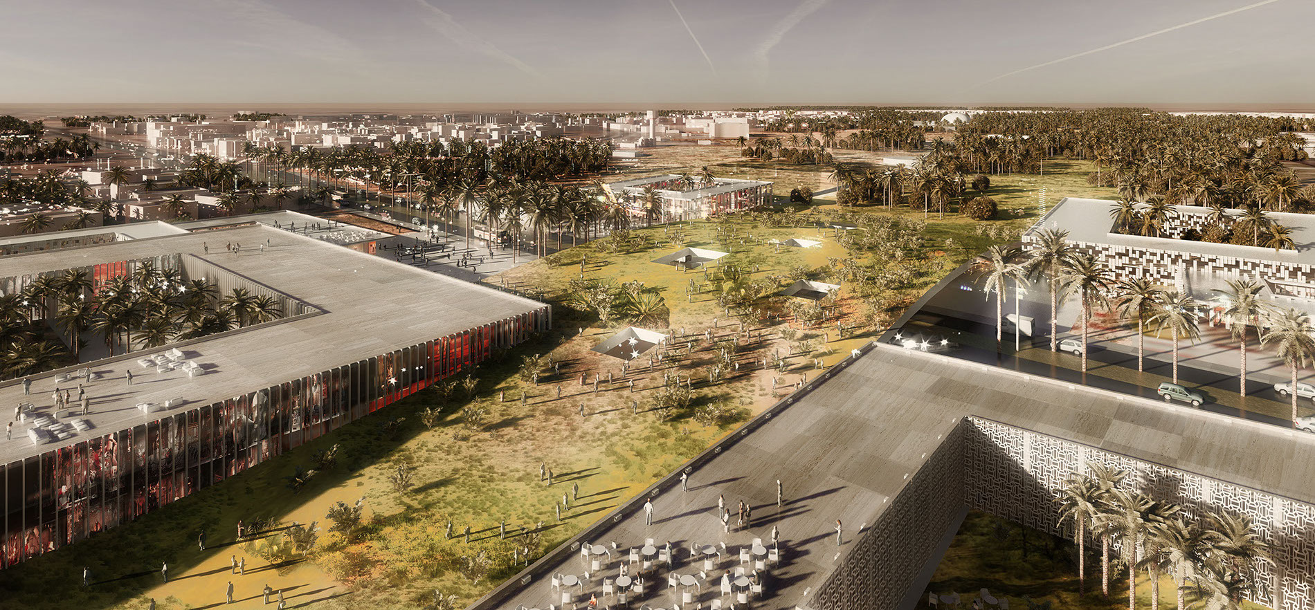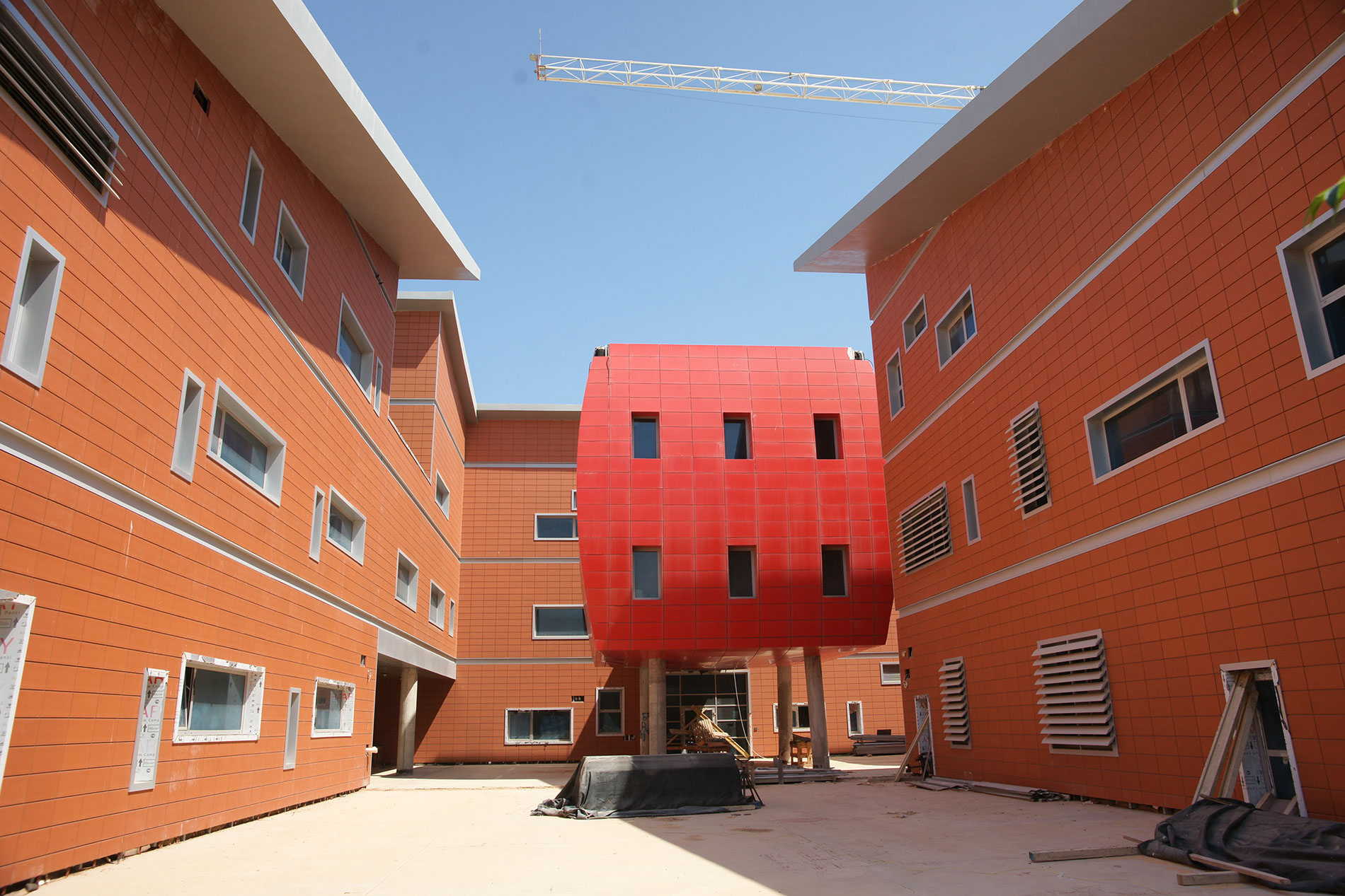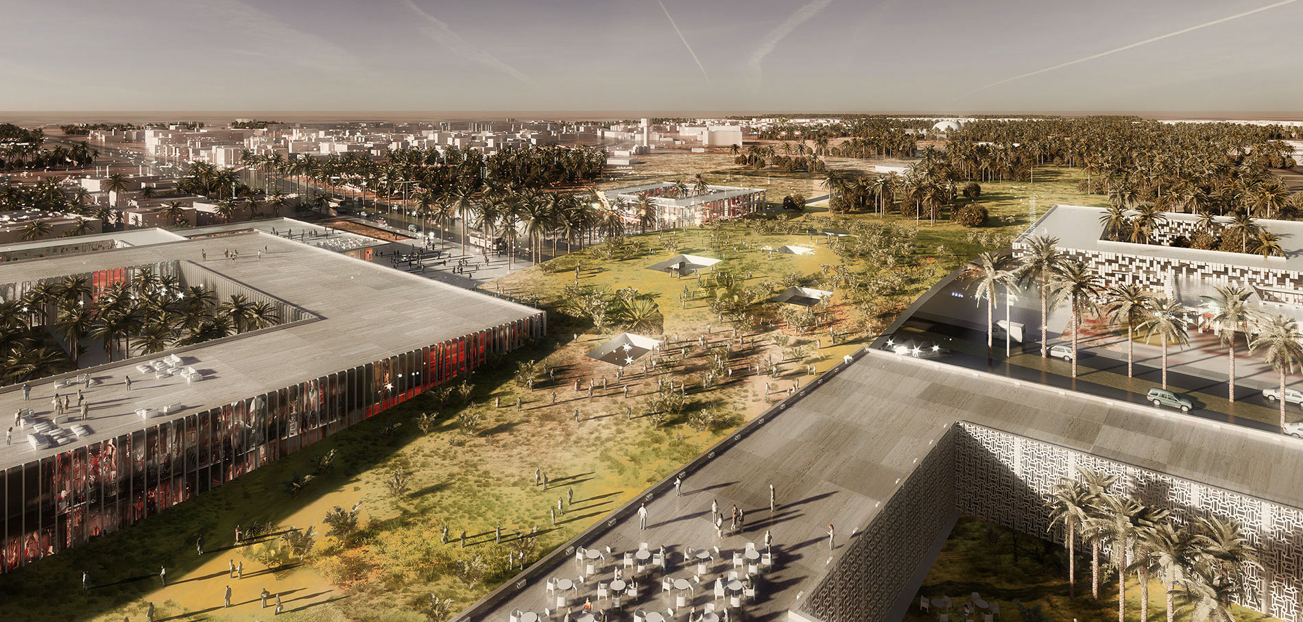 The Faculty of Physical Education sits at the western end of the main axis road on axis with the central pedestrian linear piazza and characterised by a large wrap around mashrabia screen that acts as sun shading to both the outside walls of the teaching wings and the roof.