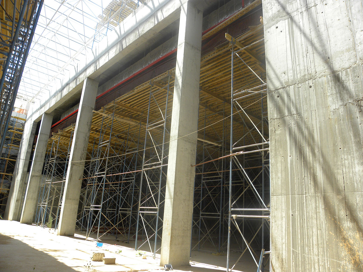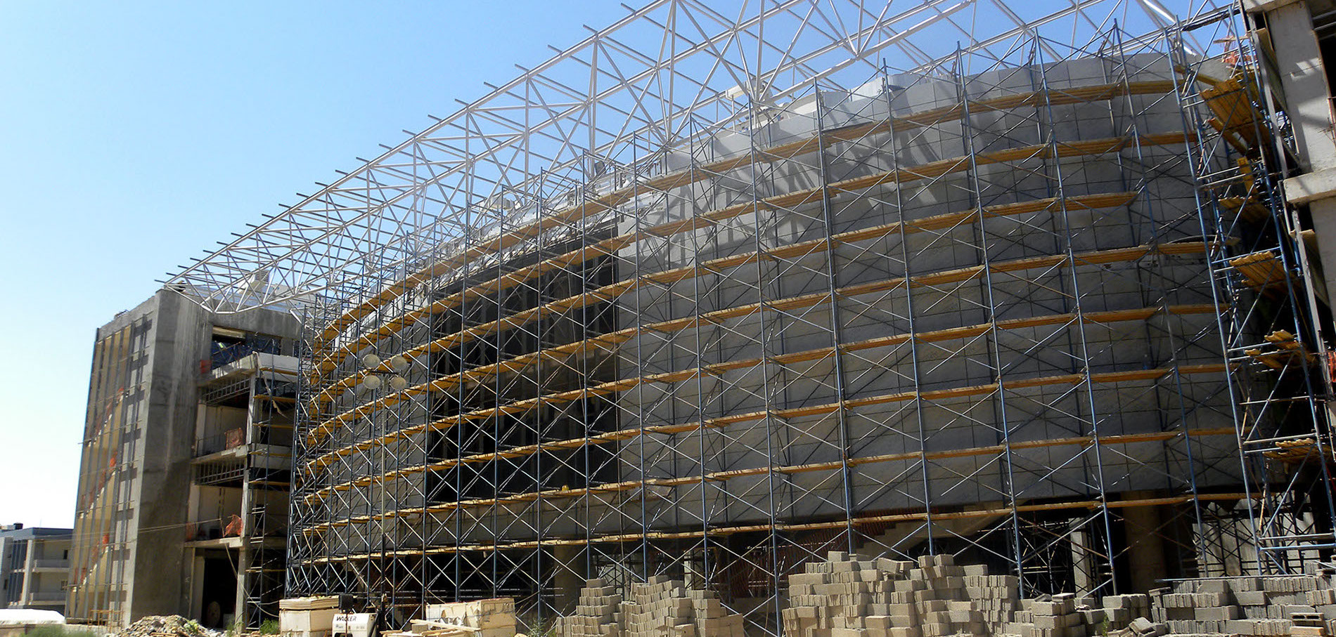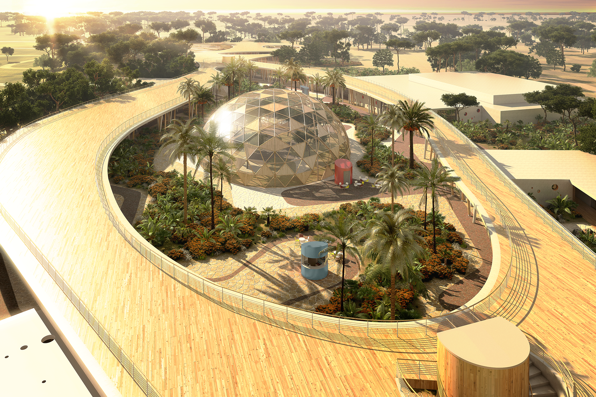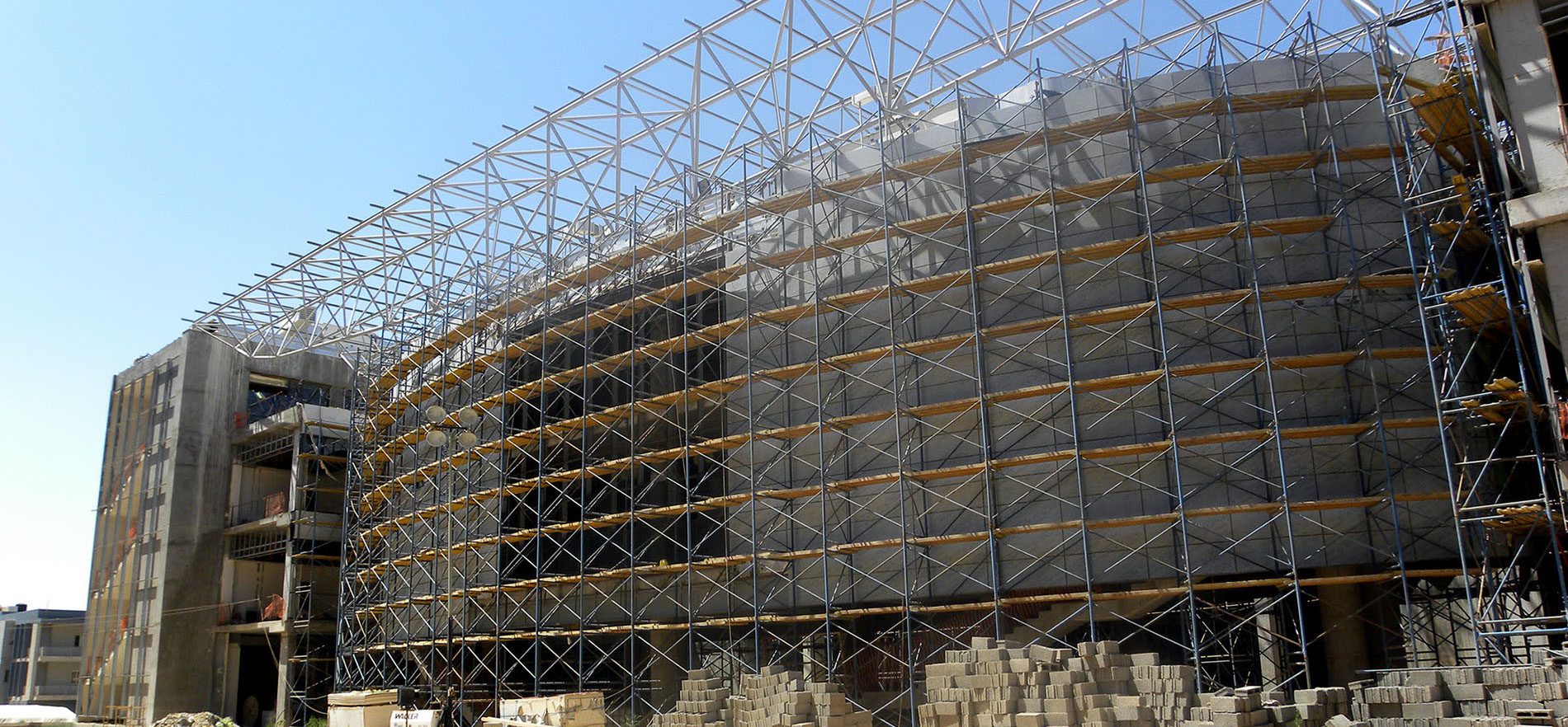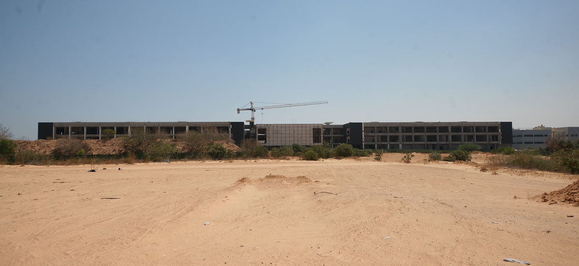 The Faculty of Physical Education sits at the western end of the main axis road on axis with the central pedestrian linear piazza and characterised by a large wrap around mashrabia screen that acts as sun shading to both the outside walls of the teaching wings and the roof.